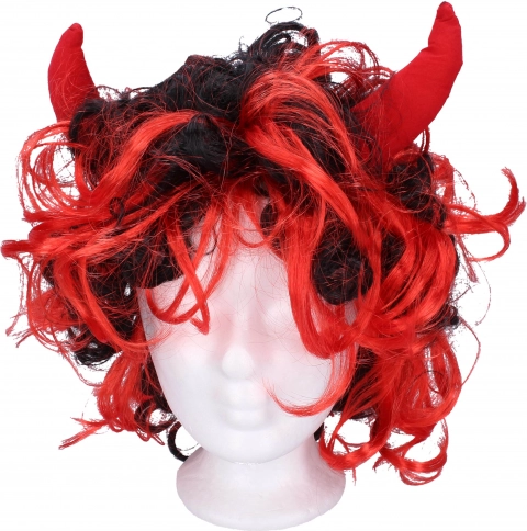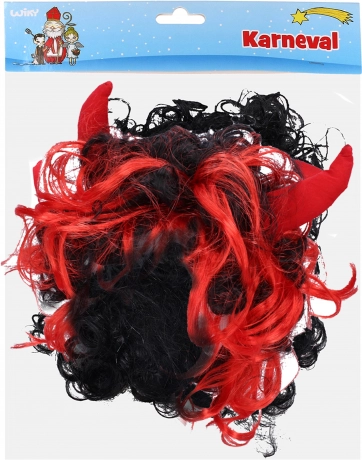 Stilet karnevalsparyk med røde horn og markante røde lokker, gennemtrukket af sorte striber. Ideel til både børne- og voksenkostumer som djævel. Markant look, nem at tage på og fantastisk til Sankt Nikolaus, karneval og fester. Velegnet fra 6 år.