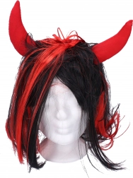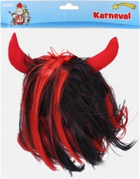 Skab på få øjeblikke et autentisk infernalsk look. Denne paryk kombinerer fyldigt sort hår med markante røde striber og lette tekstile horn, som holder formen og giver kostumet det rette pift.