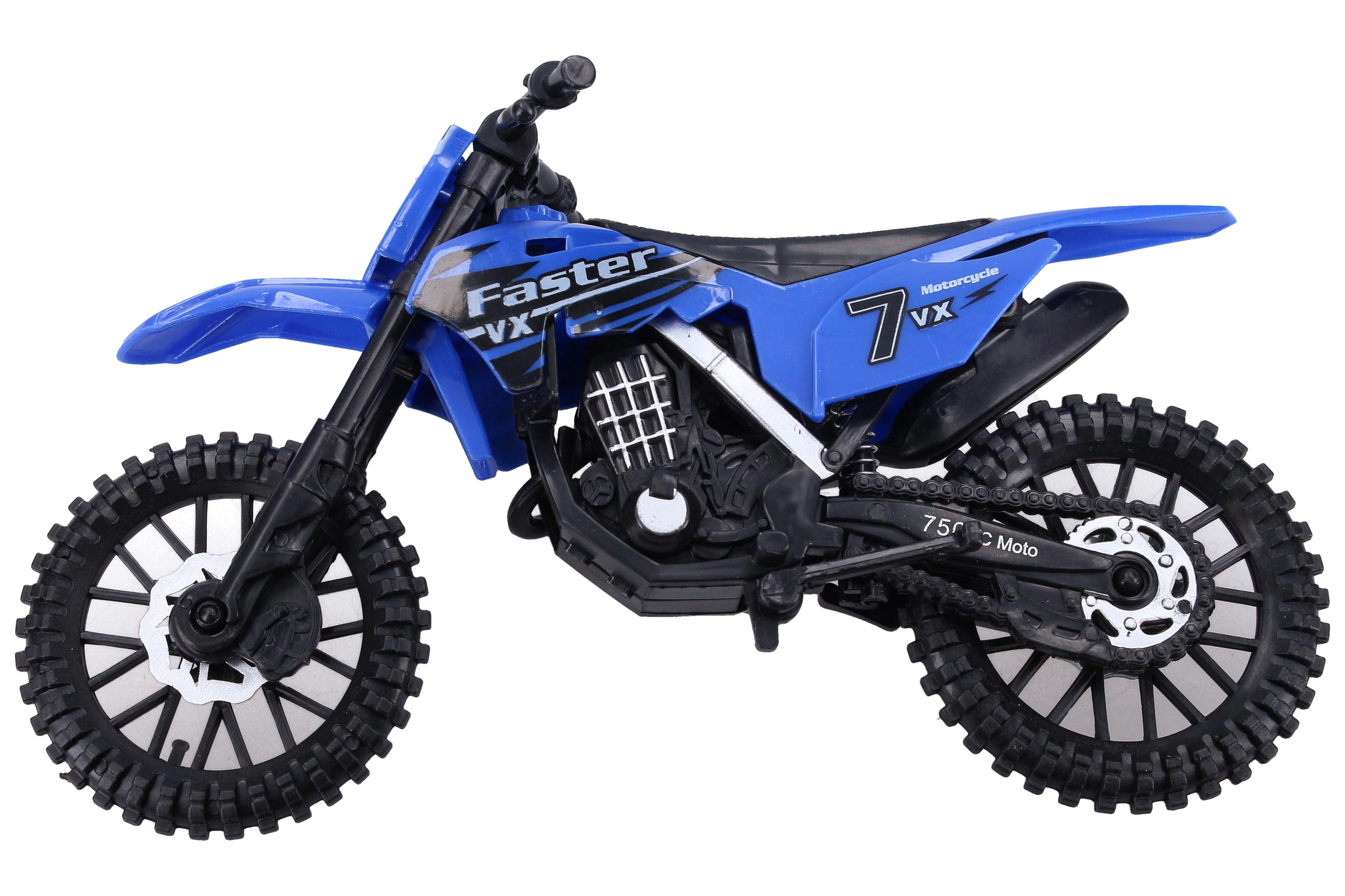 Motorcyklen fås i 3 farvevarianter med racergrafik (numre, tekster) og en imponerende offroad-stil. Den kompakte størrelse på 19 cm passer perfekt i en barnehånd og i rygsækken på tur.