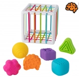 InnyBin gitter-indsætningslegetøj. Kubbens ramme er af plast. Gitteret består af elastiske snore. Forskelligt formede klodser af blødt materiale kan let skubbes gennem gitteret.