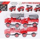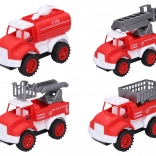 Denne pakke indeholder fire røde brandbiler med en længde på 10,5 cm, hver repræsenterer en anden type udrykningskøretøj: