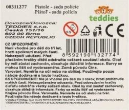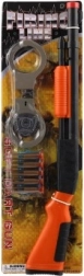 Sættet indeholder alt nødvendigt til at lege politibetjent, inklusiv gevær, patroner, håndjern og skilt.