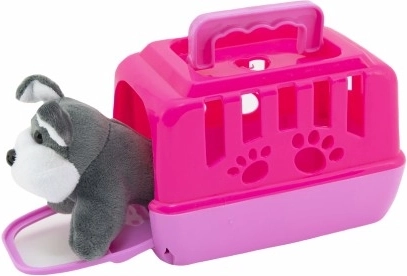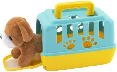 Dette sæt kombinerer en blød plyshund og en let plastboks med ventilationshuller og håndtag for nem transport. Børn kan lege at passe dyret, tage det med på tur og lægge det til at sove – alt sammen på en sjov og sikker måde.