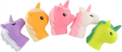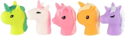 Dette sæt indeholder fem gummi enhjørninger i forskellige farver, hver med unikt design og udtryk. De er lavet af kvalitetsmateriale, hvilket sikrer deres holdbarhed og sikkerhed under leg.