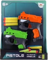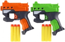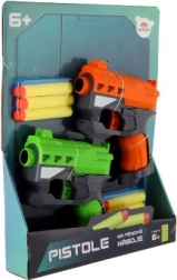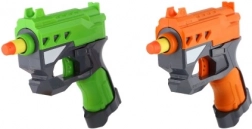 Den solide plastkonstruktion i attraktive farver (orange og grøn) er let, holdbar og kræver ingen batterier. Pakken indeholder 2 pistoler og 6 skumpile, så I har alt til en fair duel lige efter udpakning.