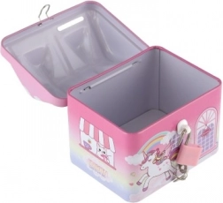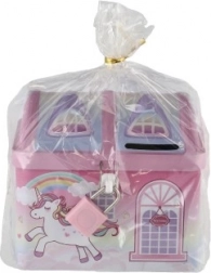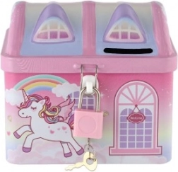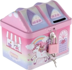 Den sjove og farverige sparegris i form af et hus er en fantastisk gave til børn, der ønsker at opbevare deres opsparing sikkert. Denne blikhus med enhjørning- og regnbuemotiv beskytter ikke kun deres skatte, men pynter også børneværelset.