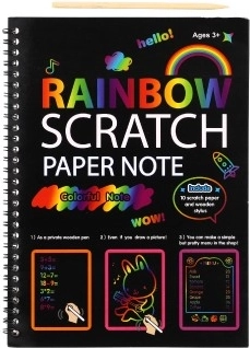 Denne skrappe-notes med regnbuebaggrund giver en enkel men fascinerende måde at skabe originale billeder på. På den sorte overflade skal du blot skrabe let, så kommer de strålende regnbuefarver frem med det samme. Fremragende til små kunstnere og som afslappende kreativitet for større børn.