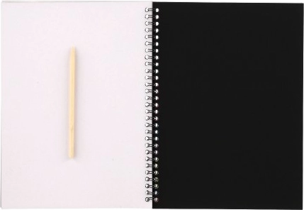 Notesen måler ca. 19 × 26 cm og er spiralbundet for nem bladren. I pakken finder du 10 ark og en træ-skrappepind, så du kan gå i gang straks efter udpakning.