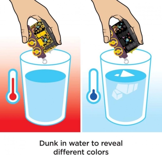 Dyp toget i varmt eller koldt vand og se farverne skifte med det samme. Effekten kan gentages igen og igen uden at blive kedelig.