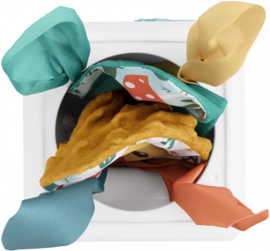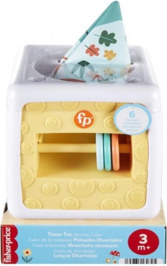 Denne interaktive lommetørklædeboks fra Fisher-Price giver babyer en sikker måde at udforske en verden af teksturer, farver og bevægelse på. Takket være de højkontrastede elementer understøtter den den tidlige synsudvikling og motiverer børn til aktiv udforskning.