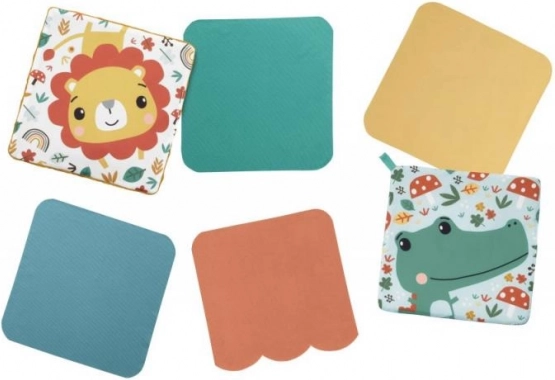Et sæt farverige stoffer med legende motiver motiverer til at trække og klemme, hvilket udvikler finmotorik og taktile sanser.