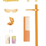 Dukken kommer med en række stilfulde accessories, herunder en kam, solbriller, bøjler, make-up palet og en drikkevarekande, hvilket gør det til et fantastisk sted for styling og leg.