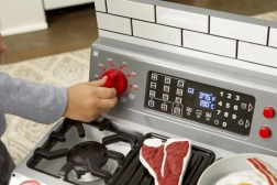 Drejeknapper og et overskueligt panel med indikatorer gør madlavningen realistisk og sjov. Børn kan indstille temperaturen og åbne ovnlågen – alt sammen sikkert og enkelt.