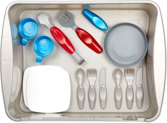 Sættet indeholder 13 stykker tilbehør (tallerkener, kopper, bestik, gryde, pande m.m.), som understøtter selvstændighed, øje–hånd-koordination og sociale færdigheder ved leg med venner.
