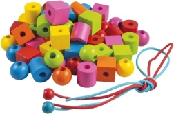 Sjovt sæt med store træperler, snor og skabeloner til den allerførste snøring. Understøtter finmotorik, øje–hånd-koordination og genkendelse af farver og former. Sikker udførelse, perler med en diameter på 20 mm er lette at holde selv for de mindste.