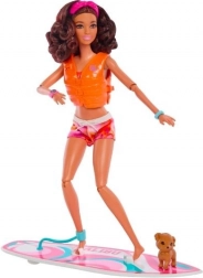 Barbie-dukken er klar til endeløs leg på stranden. Hun er iført en sporty badedragt med et iøjnefaldende hårbånd, og en stilfuld clip på hendes surfbræt holder hende sikkert på plads. Den lille hvalp er klar til at følge med og skabe sjov.