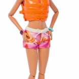 Barbie har en moderne badedragt, hårbånd og solbriller, som giver hende et stilfuldt look til enhver solrig dag på stranden.