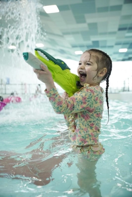Vandpistol formet som en dinosaur med vandbeholder. Pistolen er 40 cm stor.