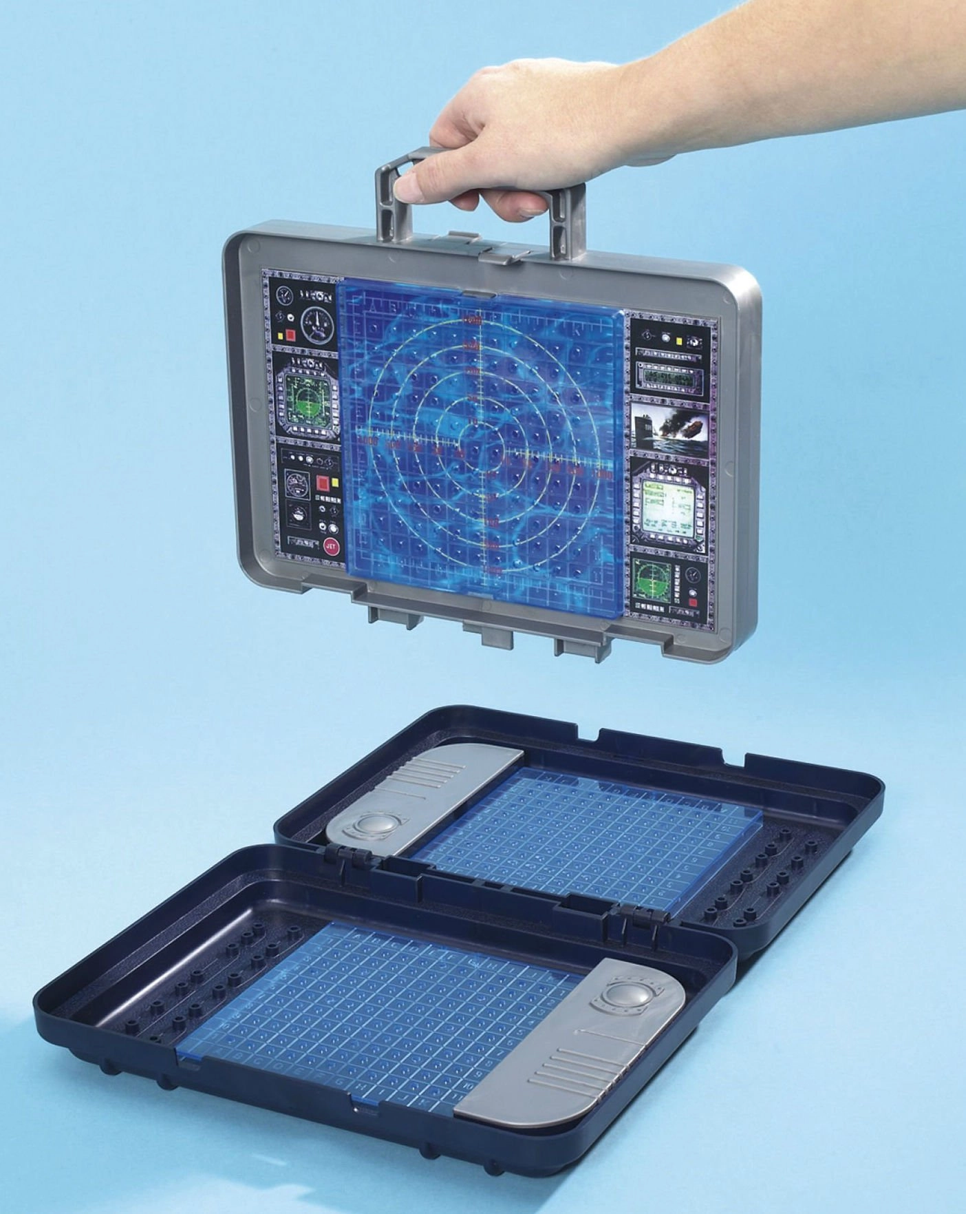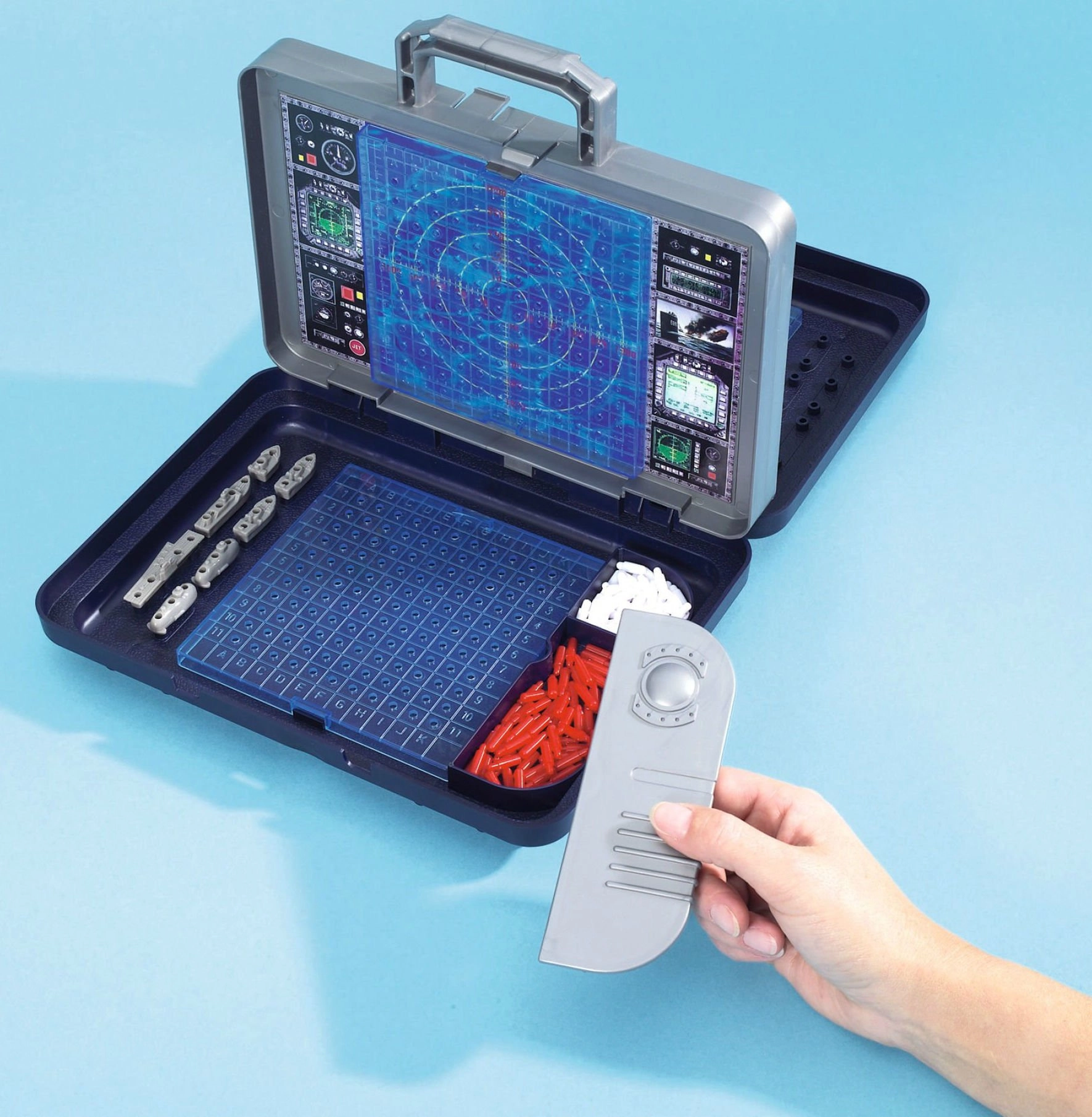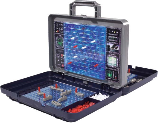Hjertet i sættet er en aftagelig lodret væg, der minder om en radar, som adskiller de to spillefelter. På den markerer du træf og forbi-skud, samtidig med at spillerne ikke kan se hinandens skibsplaceringer. Integrerede rum i kufferten holder alle dele pænt samlet.
