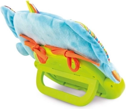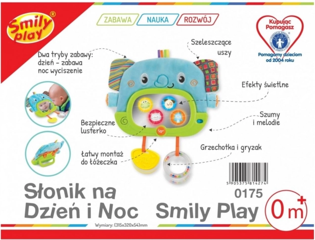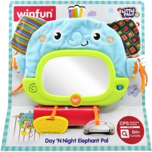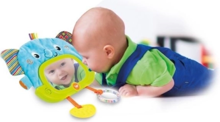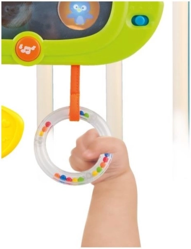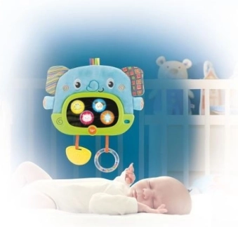 Vedhænget har automatisk slukning (30 sekunder om dagen og 3 minutter om natten). Det er et legetøj fuld af overraskelser. Skjulte dyrefigurer dukker op i sikkerhedsspejlet og lyser blidt. Knitrene ører stimulerer hørelse og berøring. Bideringen lindrer ømme gummer. Raslende kugler fanger opmærksomheden med farver og lyd. Materialernes teksturer viser, at noget kan være blødt eller hårdt, glat eller ru.