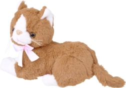 Katten Flico er syet i blød brun-hvid plys, som føles behagelig at røre ved og indbyder til kram hele dagen.