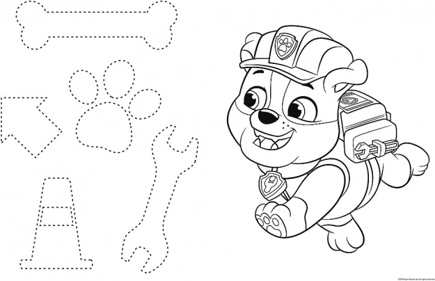På den ene side en farverig scene med PAW PATROL-heltene, på den anden side en malebog og en enkel leg med farvelægningselementer.