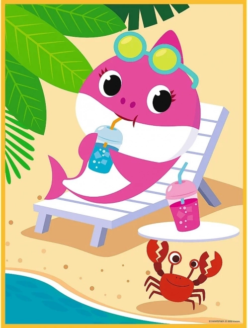Dobbeltsidede puslespil Baby Shark er perfekt underholdning for små børn fra 2 år. Hver side af puslespillet tilbyder en anden scene, hvilket giver op til 4 forskellige aktiviteter i ét produkt. På den ene side finder du glade hajer på stranden, mens der på den anden venter et undervandseventyr, som udvikler deres fantasi.