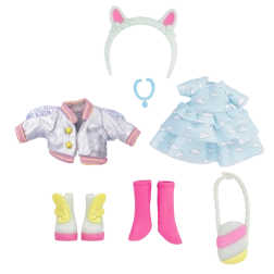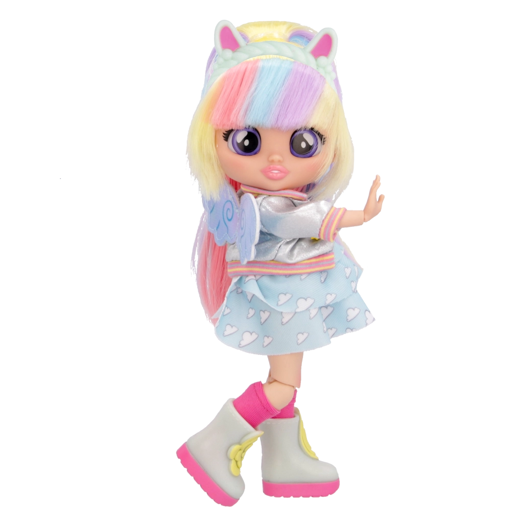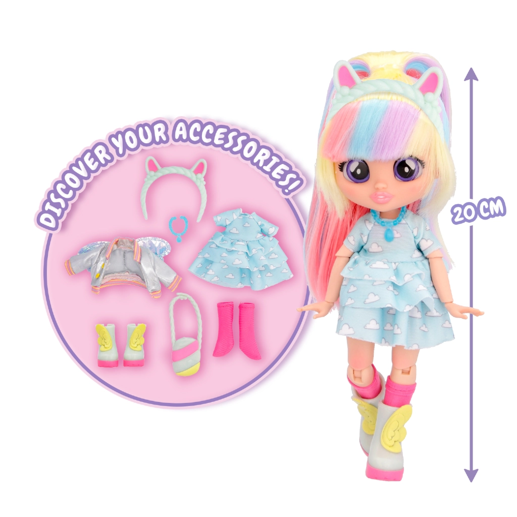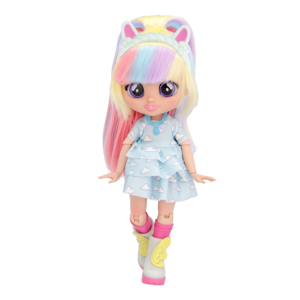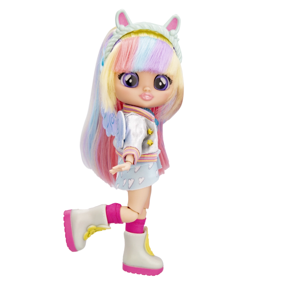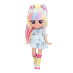Dotty har stilfuldt farverigt hår, krystalklare øjne og en bevægelig krop! Hun bærer moderigtigt tøj og en særlig prikket kjole med halskæde, en metallic læderjakke, Mary Jane-plateausko og ternede strømper! Tilføj en crossbody-taske, en yndig hue med hundeører og det matchende BFF-halssmykke!