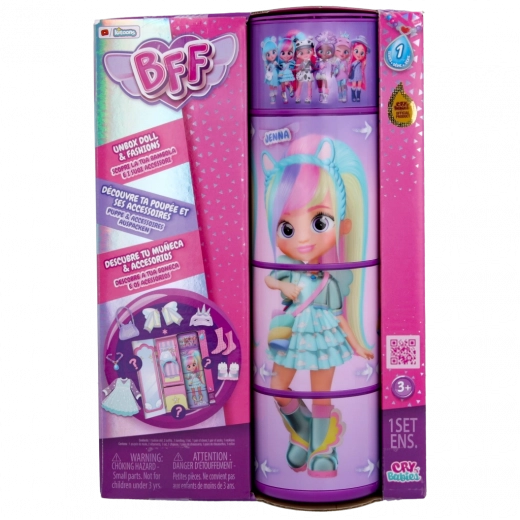 Mød de nye bedste venner, BFF! Dine yndlingsfigurer fra filmen Cry Babies Magiske Tårer er nu blevet teenagere! De er 13 år, og masser af eventyr venter. I kollektionen er der 6 dukker at samle på, og hver af dem er klædt i moderne tøj efter den nyeste mode. De er 15 cm høje, har farverigt hår, krystalklare øjne og fuldt bevægelige kroppe. Hvilken bedste veninde vælger du? Drej på tuben og find ud af det! Pak ud og opdag deres garderobe sammen med mere end 9 overraskelser: 2 stykker tøj, en taske, et hårbånd eller en hårbøjle, et par matchende sko med strømper og en halskæde! BFF-dukkerne har silkeblødt nylonhår og virkelig moderigtigt tøj! Hver dukke er pakket i en unik æske, som også er deres garderobe! Ved at dreje på tubens dele kan du opdage forskellige positurer, din bedste veninde kan indtage!