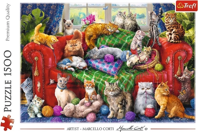 Nyd afslapning med at lægge et imponerende puslespil med et motiv af søde katte på sofaen. Puslespillet fra TREFL byder på 1500 brikker og måler efter samling cirka 85 × 58 cm – ideelt til indramning og udstilling.