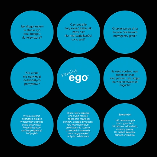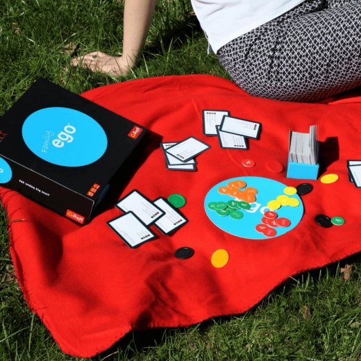 EGO Family er et spændende selskabsspil i familieudgave, der åbner for emner om dig, dine nærmeste og dit EGO. Træk et spørgsmål, vælg dit svar i hemmelighed, og lad de andre gætte. Hvor mange jetoner tør de satse på, at de kender dig? Vinderen er den, der samler flest jetoner og viser den bedste dømmekraft.