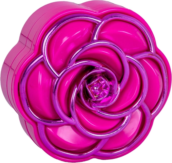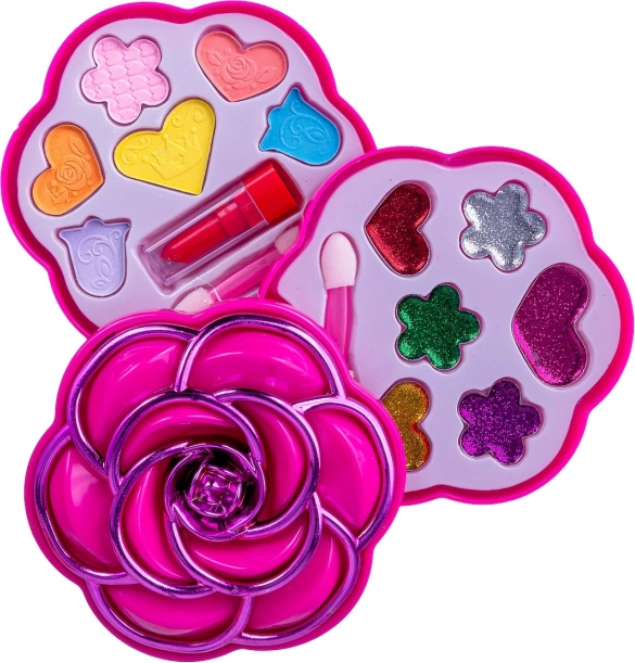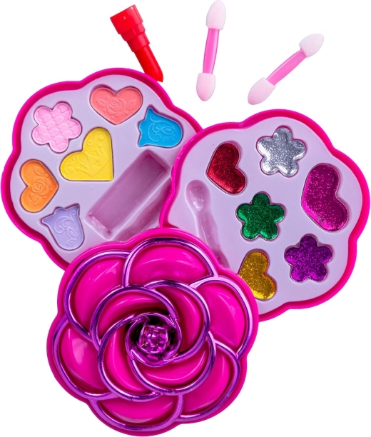 Sødt kosmetiksæt til små prinsesser i form af en blomst, som giver de første skridt ind i makeup-verdenen. Indeholder to etager øjenskygger – glitrende og brokade samt pastelfarver – og en rød læbestift. Det kompakte etui i den populære lyserøde farve passer nemt i den lille dames håndtaske, når det er lukket.