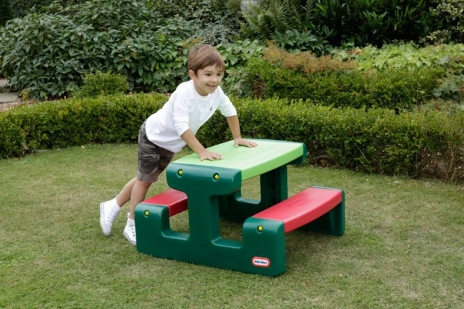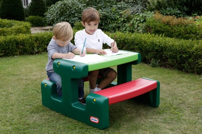 Praktisk børne-picnicbord fra LITTLE TIKES i en kombination af grøn og rød, som tilbyder en stabil overflade til leg og spisning samt komfortable, integrerede bænke. Det er vejrbestandigt, nemt at rengøre og takket være de afrundede kanter er det sikkert for børn. Ved bordet kan der lege eller snackes komfortabelt af op til fire børn samtidig.
