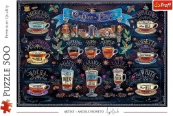 Find ro med et puslespil på 500 brikker med motivet Kaffetid – en legesyg, tegnet collage fuld af lækre kaffemotiver. Det færdige billede måler 480 × 340 mm. Fremstillet af materialer i høj kvalitet med kalandreret, lysreflekterende papir for nemmere samling og af miljøvenlige råvarer. Fremstillet i Polen.