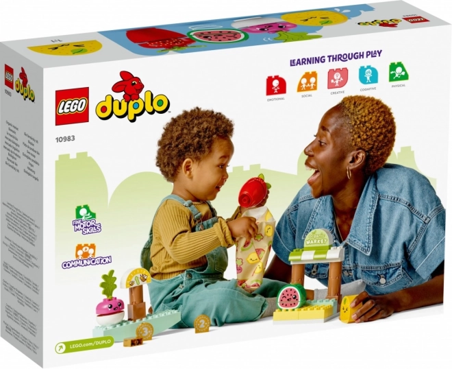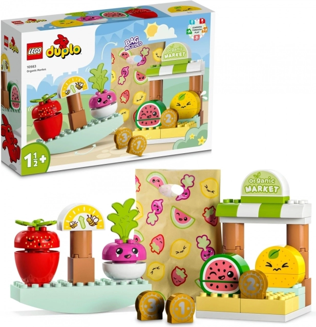 LEGO DUPLO Øko bondens marked er et perfekt, lærende legetøj fyldt med sjov. Sættet indeholder en vandmelon, en citron, en ræddike og et jordbær, alle med forskellige ansigtsudtryk, en vægt, tre mønter og en stofpose.