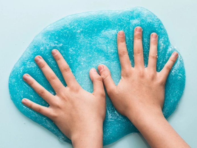 - Færdig blå slime, kunstig sne (mængde ikke angivet)