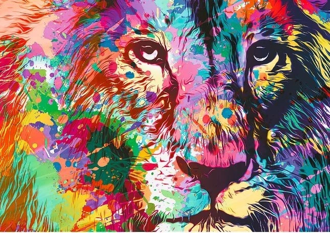 - Motiv: Farverig løve – markant, moderne illustration fuld af farver.