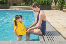 Takket være justerbare spænder og godt greb er vesten sikker og behagelig. Den hjælper børnene med at holde hovedet over vandet.