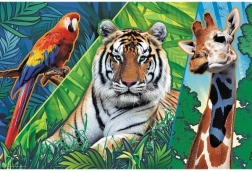 En farverig collage af dyr med tiger, papegøje og giraf motiverer til at lægge puslespillet og ser fantastisk ud som dekoration, når det er færdigt.