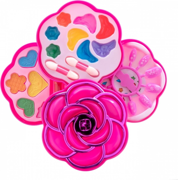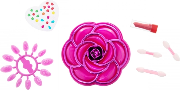 Sødt mini makeupsæt i en æske formet som en blomst, som vil glæde enhver begyndende makeupartist. Indeni finder du 3 niveauer fyldt med kosmetik: øjenskygger, læbestift, lipgloss samt kunstige negle og klistermærker – ideelt til sikker og legende afprøvning af makeup.