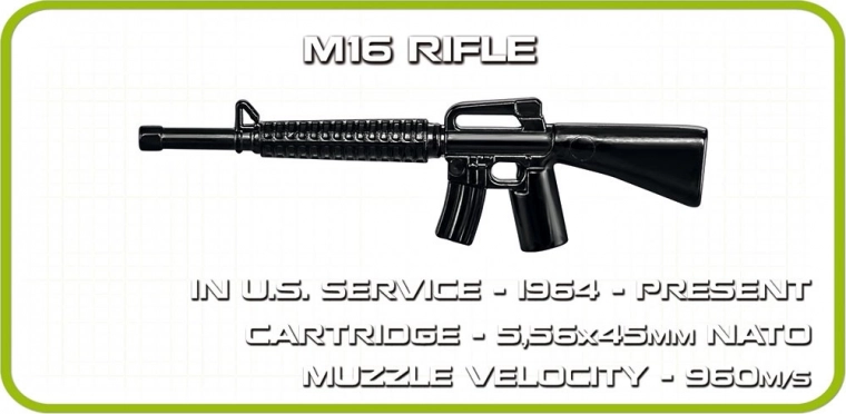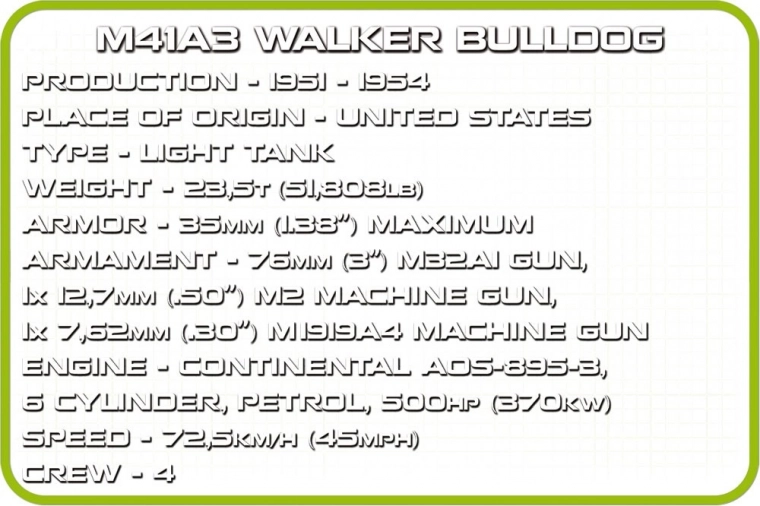 Sættet indeholder 2 detaljerede amerikanske soldaterminifigurer med tilbehør samt en plade med navnet M41A3 Walker Bulldog til flot præsentation af modellen.