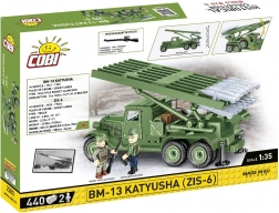 Det legendariske raketkaster-system BM-13 KATJUŠA i skala 1:35 til COBI-figurer tilbyder en tro kopi på ZIS-6-chassis af 440 klodser med funktioner som justerbar vinkel på affyringsskinnerne, åbningsbar kabine og aftagelige raketter. Sættet inkluderer 2 figurer af sovjetiske soldater og holdbare tryk uden klistermærker.