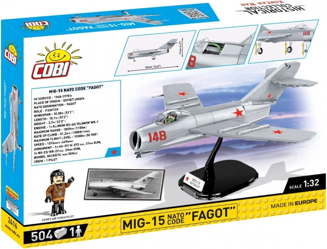 Byg den legendariske sovjetiske jetjager MiG-15 FAGOT i skala 1:32 af 504 klodser. Modellen har åbningsbar cockpit, bevægelige hjul, detaljerede tryk uden klistermærker og en præsentationsstand med navneskilt. Perfekt til fans af luftfart, militaria og historien om Koreakrigen.