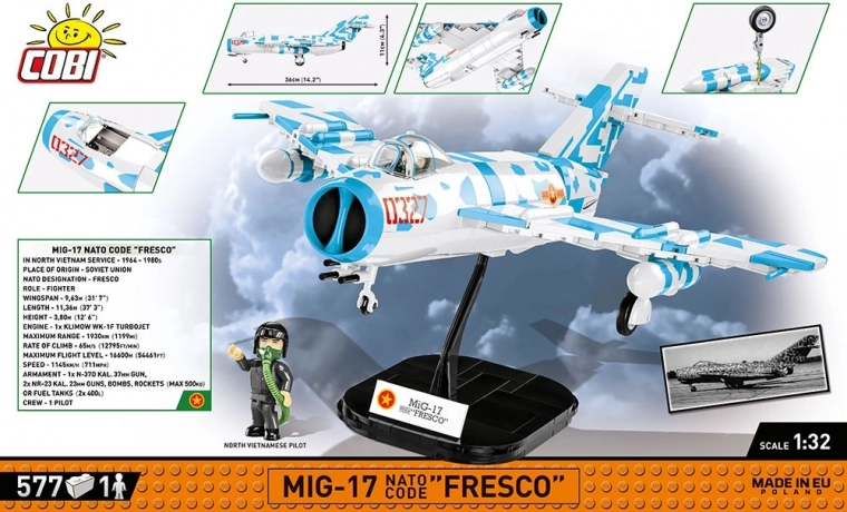 - Skala 1:32 og 577 dele for en detaljeret MIG‑17-silhuet