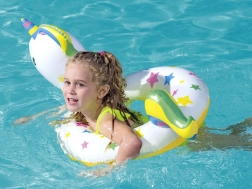 Det farverige enhjørningemotiv med stjerner fanger opmærksomheden og forvandler svømningen til timevis af sjov.