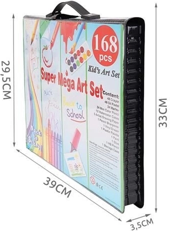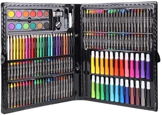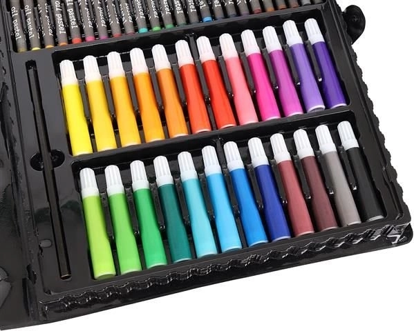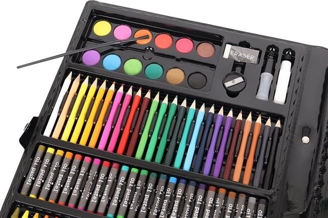 Super Mega Sæt med Kunstnerartikler 168 stk. tilbyder alt, hvad du behøver for at skabe kunstværker: 24 farveblyanter, 24 farvetuscher, 48 oliepasteller, 48 voksfarver, 12 akvarelfarver og meget mere. Alle materialer er elegant organiseret i et praktisk etui, hvilket sikrer nem adgang og overblik.