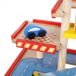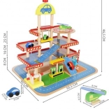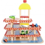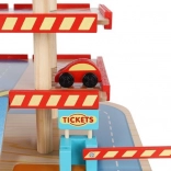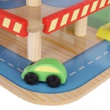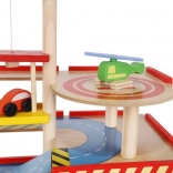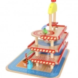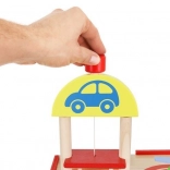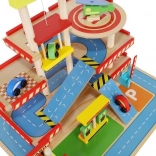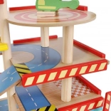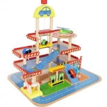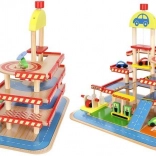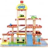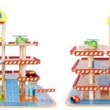 Det farverige træparkeringshus med flere niveauer giver børn timevis af leg og udvikler både finmotorik og fantasi. Sættet indeholder en vaskehal, tankstation, kasse, elevator, heliport og køretøjer. Den stabile konstruktion af sikkert træ og realistiske detaljer understøtter kreativ leg og læring af trafiksituationer.