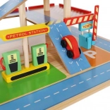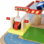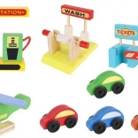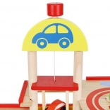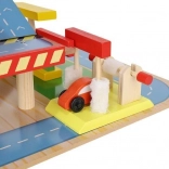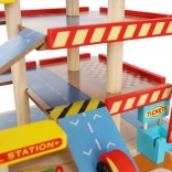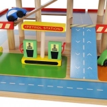 Oplev et robust træparkeringshus med garage, der byder på tre legeetager forbundet med ramper, en funktionel elevator og en øverste heliport. Børnene vil elske de realistiske elementer som bilvask, tankstation og billetsalg, som skaber autentiske trafiksituationer.