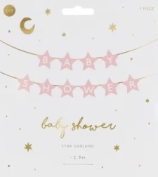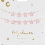 Giv din babyshower et charmerende udtryk med et papirbanner med stjerner og teksten Baby Shower. Den lyserosa udgave er ideel til blide, elegante og fotogene dekorationer.