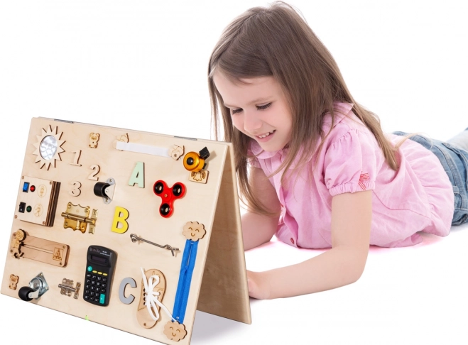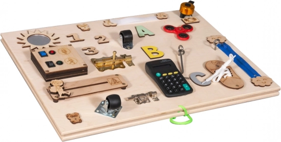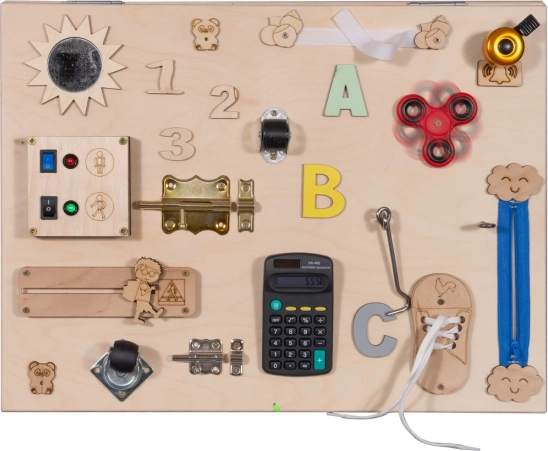 Indeholder forskellige elementer som låse, karrusel og lommeregner, der udvikler finmotorik og kognitive evner.